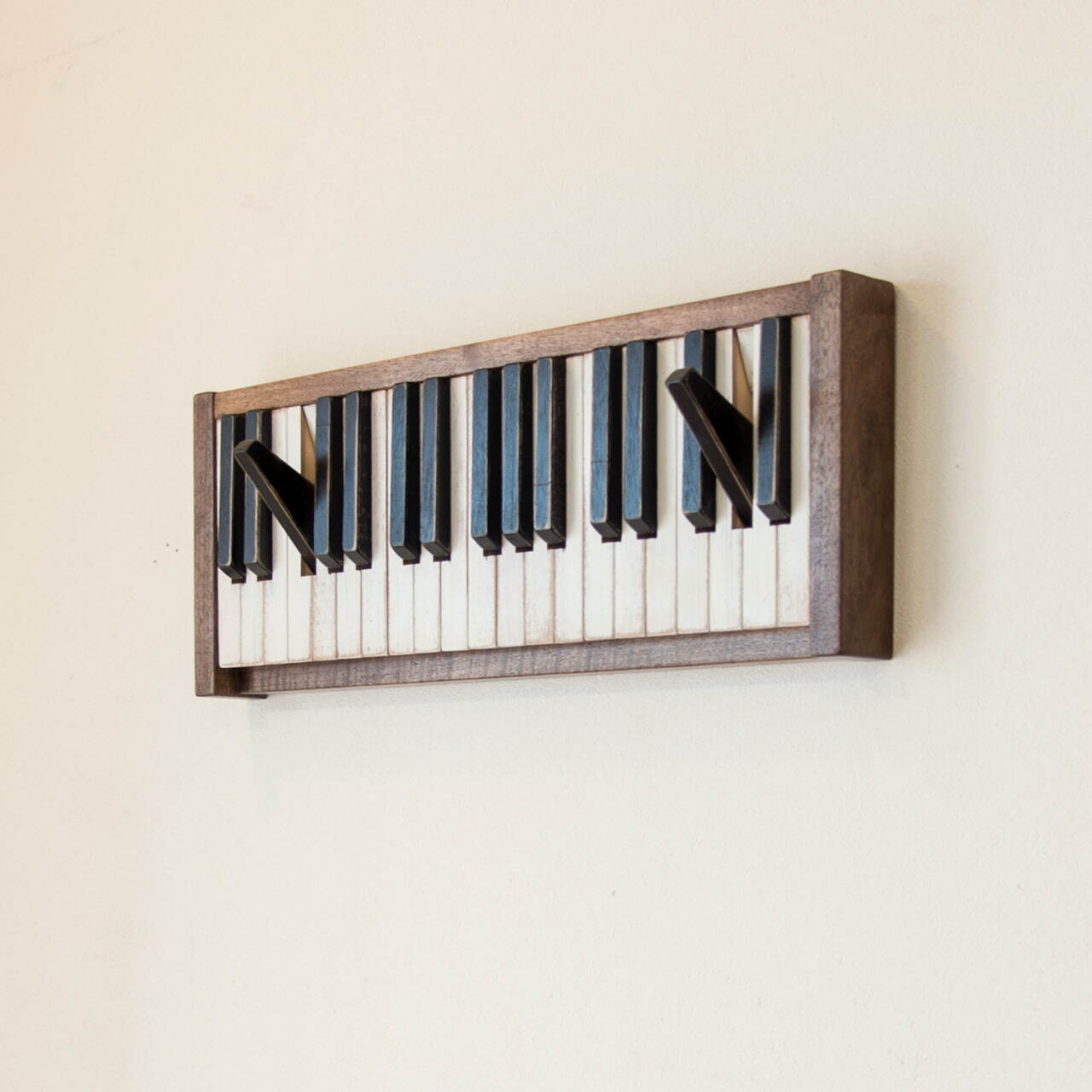 ウォールナットの温かみを感じさせるこのピアノのウォールハンガーは、インテリアとしても楽しめる魅力的なアイテムです。古いピアノの鍵盤をイメージし、実際の鍵盤サイズに近いデザインが特徴。フック部分はピアノの黒鍵として機能し、使いたい数だけ引き出せるので、ジャケットやバッグ、帽子などを効率的に収納できます。(最大15箇所)