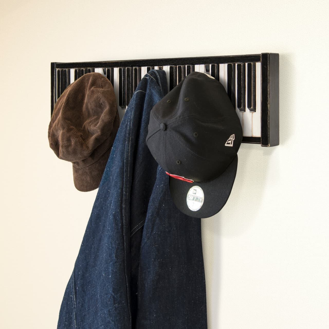 使い込まれた古いピアノをイメージし、出来るだけ本物のピアノの鍵盤サイズに近づけたウォール ハンガーラック。ピアノの黒鍵を弾くとフックになり、使いたい数だけ引き出せてジャケットやバッグ、帽子などを同時に収納することができます。(最大20箇所)