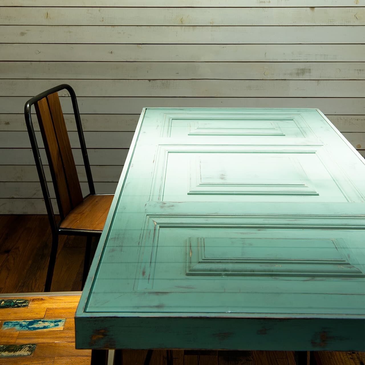 アンティークのドアをテーブルとしてアップサイクルしたかのようなデザインと独特の風合いを持つDOOR TABLE。